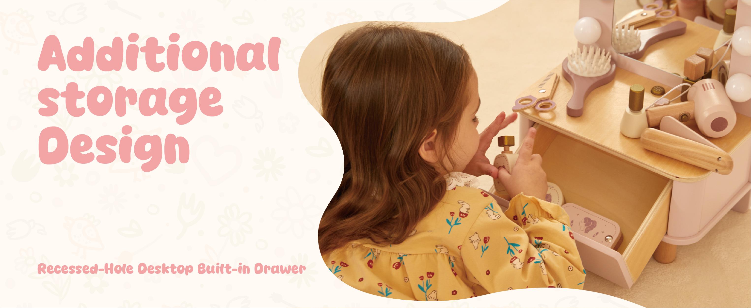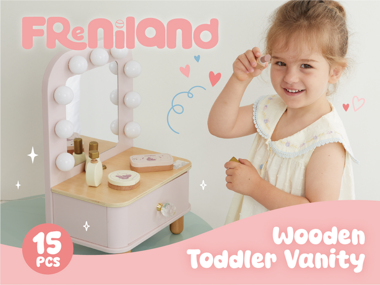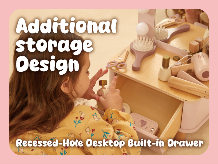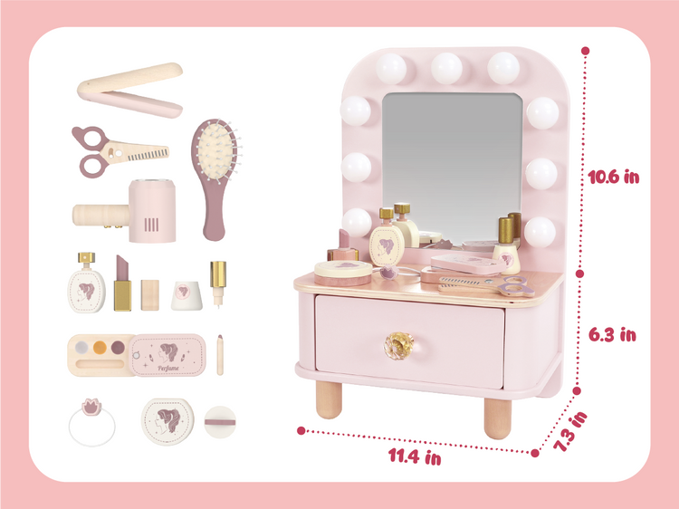 Charming dressing table with accessories for pretend play. This role play vanity set for kids 3Y+ encourages imaginative role-play and develops fine motor skills. Features a child-sized mirror, drawers, and accessories like lipstick, comb, and jewelry. Safe, durable construction with smooth edges. Perfect for encouraging creative play, social interaction, and independent play. Ideal for playrooms, early learning centers, or as a gift for children who love pretend play and beauty routines. Supports Montessori-style learning through role-play activities that develop coordination and confidence.