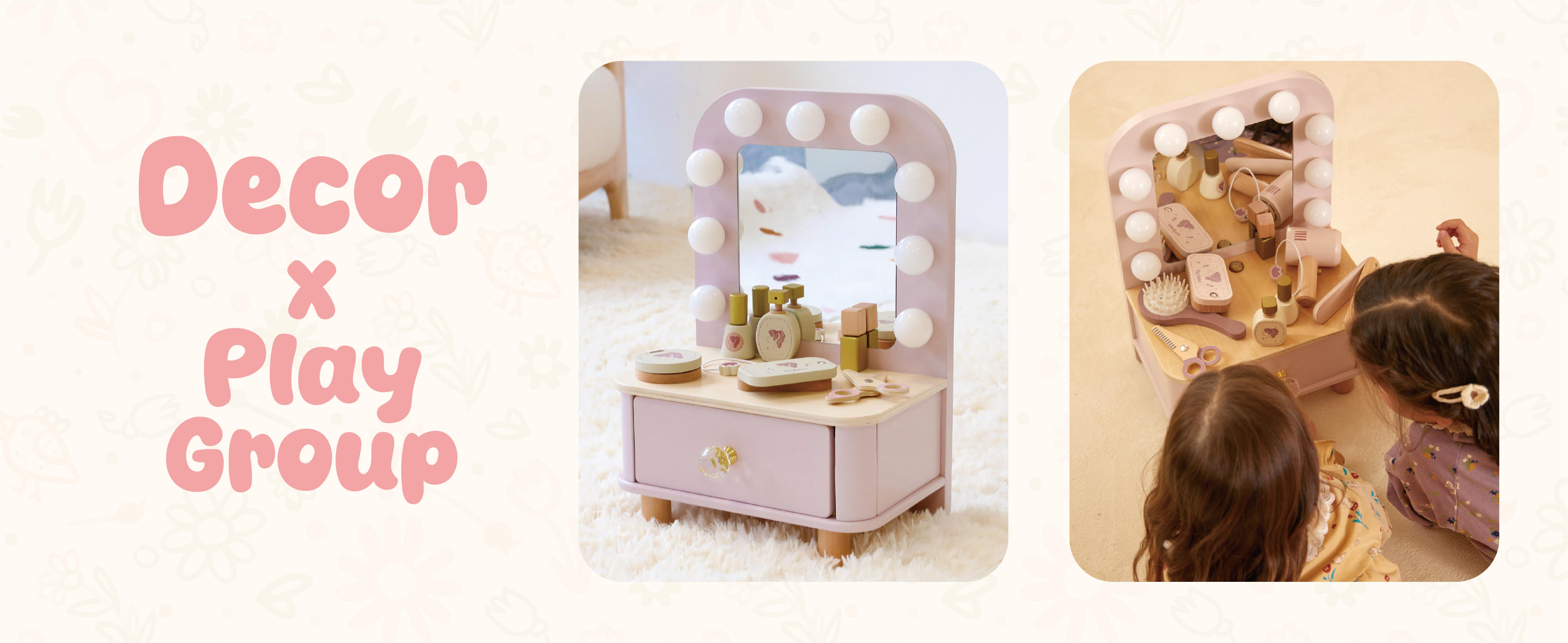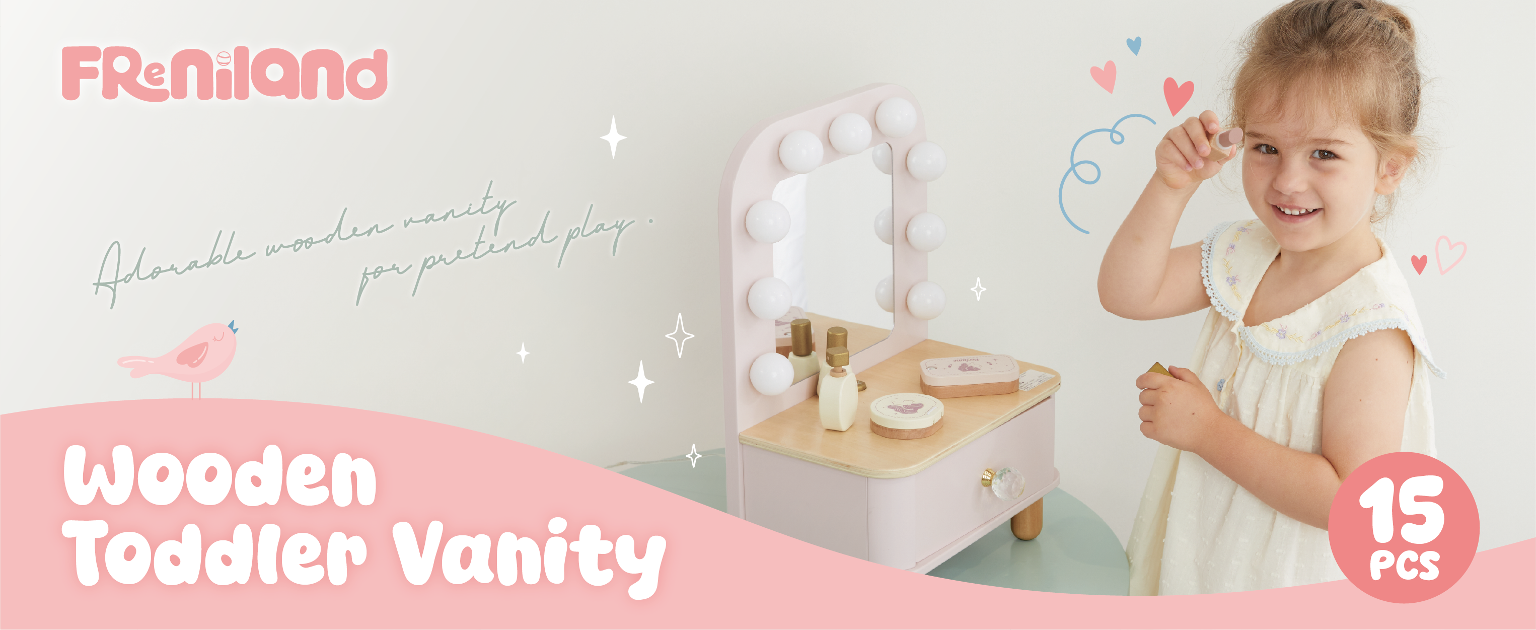 • Dressing Table Fun: 15-piece wooden set with mirror and accessories.