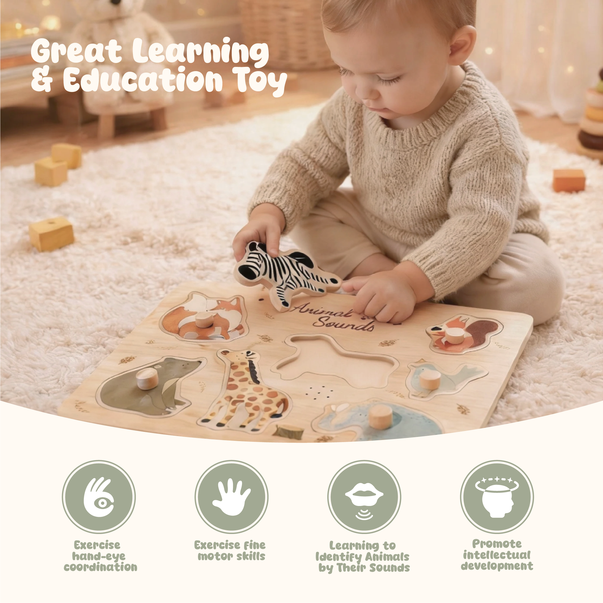 • Sound Puzzle Fun: 8-piece forest animal matching set.