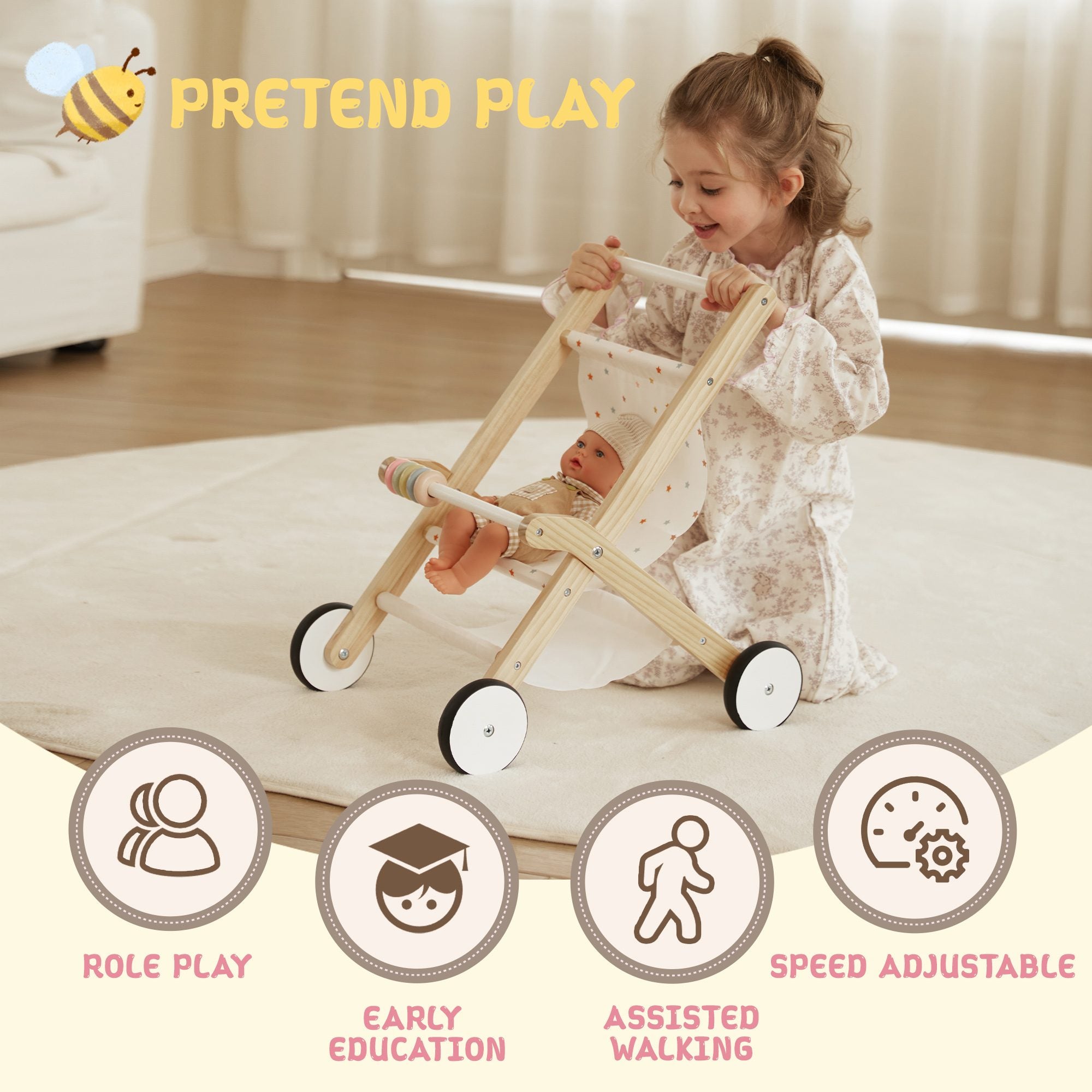 Guanyi Baby Doll Stroller: A wooden stroller for dolls, perfect for nurturing play and developing coordination. Age:18M+