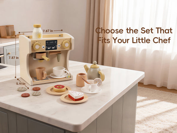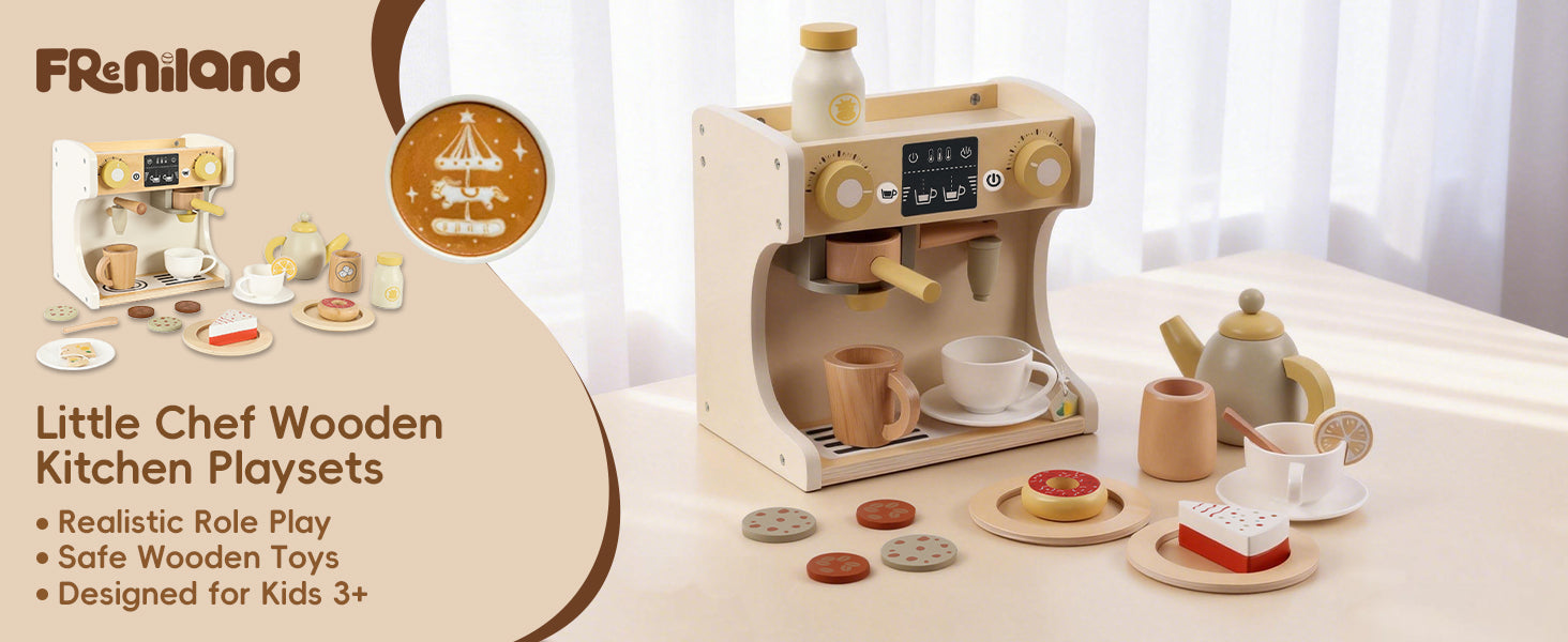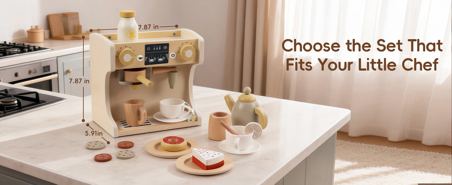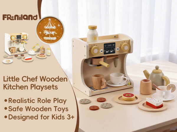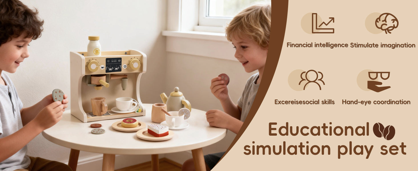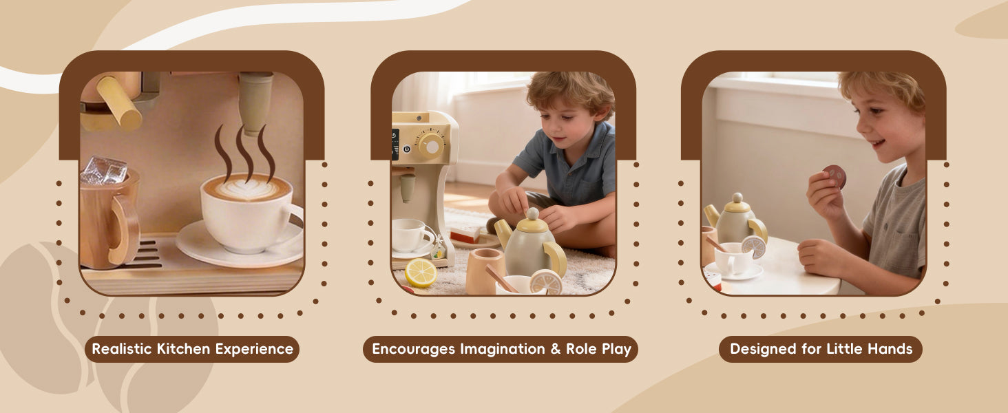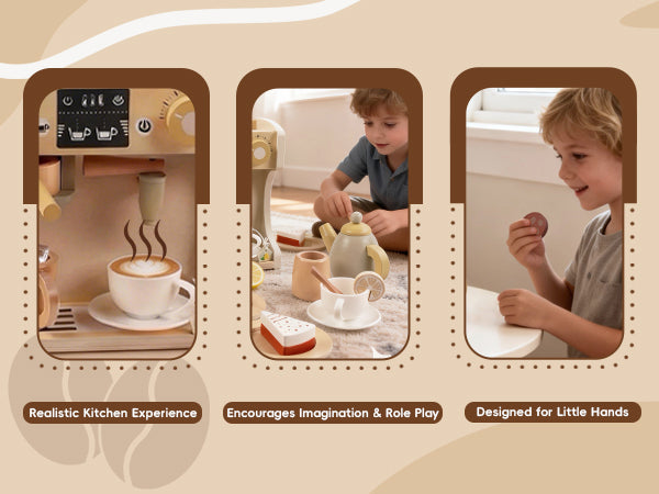 GuanYi presents a 22-piece wooden coffee machine play set. With cups, coffee accessories, and interactive parts, children can enjoy imaginative role play while developing fine motor skills, coordination, and creativity through hands-on fun.