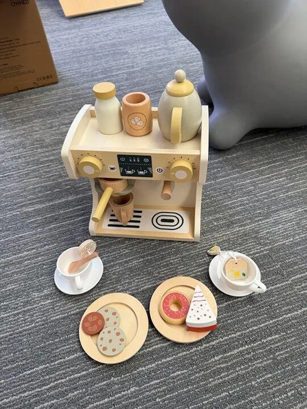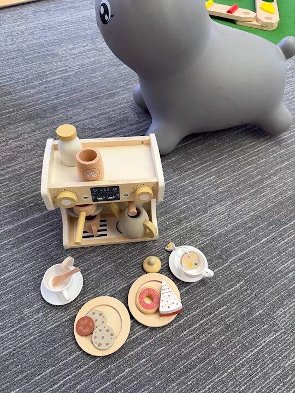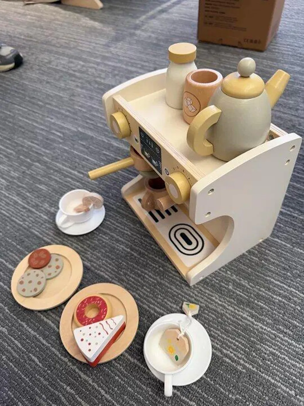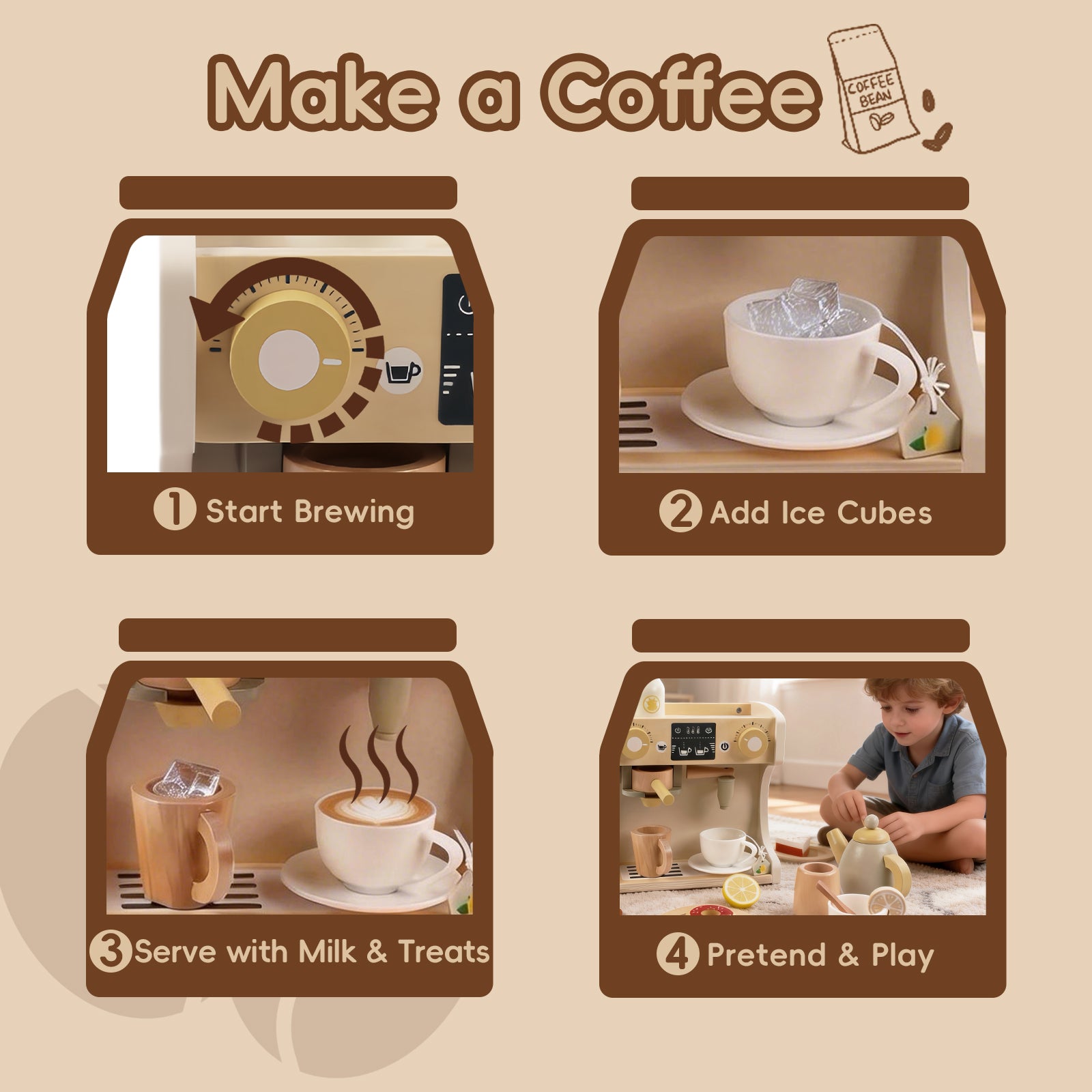 GuanYi presents a 22-piece wooden coffee machine play set. With cups, coffee accessories, and interactive parts, children can enjoy imaginative role play while developing fine motor skills, coordination, and creativity through hands-on fun.